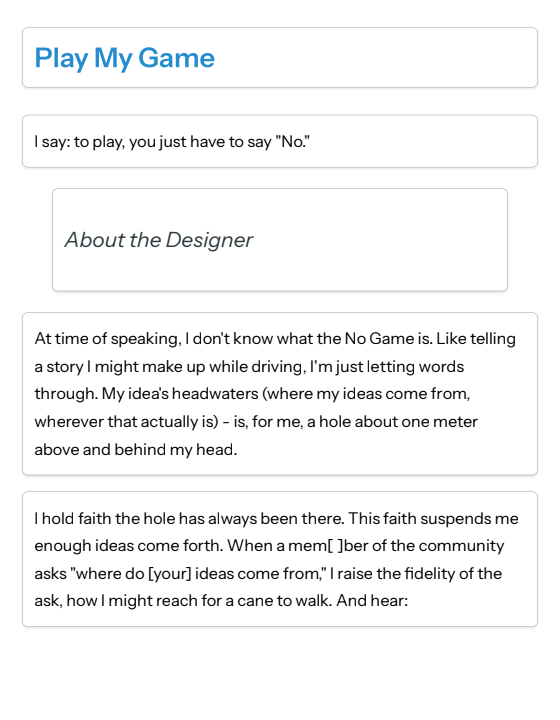 At time of speaking, I don’t know what the No Game is. Like telling a story I might make up while driving, I’m just letting words through. My idea’s headwaters (where my ideas come from, wherever that actually is) - is, for me, a hole about one meter above and behind my head.