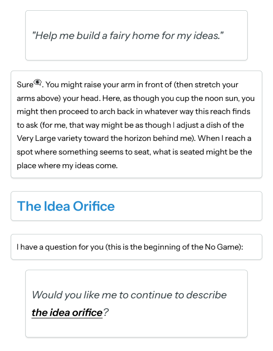 I ask them if they’d like to help me practice my “no”s. Their “yes” is the yes toward a friend who is reheasing their lines. I invite: “play the No Game with me.” They say this would be fine. I do a little dance. I talk (discovering what the No Game might be).
