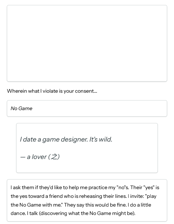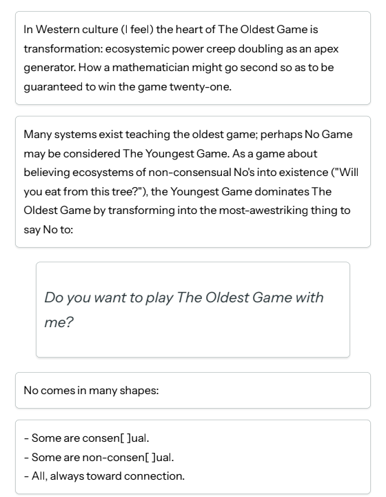 Many systems exist teaching the oldest game; perhaps No Game may be considered The Youngest Game. As a game about believing ecosystems of non-consensual No’s into existence (“Will you eat from this tree?”), the Youngest Game dominates The Oldest Game by transforming into the most-awestriking thing to say No to: