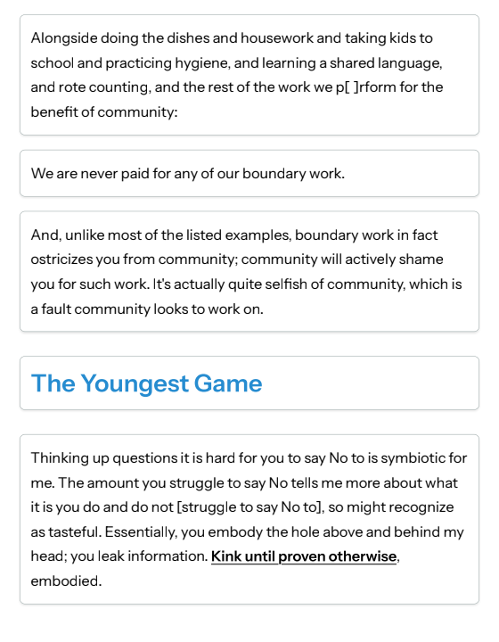 And, unlike most of the listed examples, boundary work in fact ostricizes you from community; community will actively shame you for such work. It’s actually quite selfish of community, which is a fault community looks to work on.