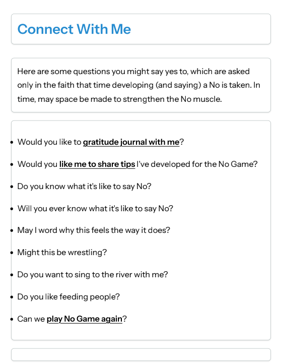 This is when you practice your “no” (might you like). How I play the No Game as it is discovered: I try and have the No (the No the person I am with attempts to say) feel like the number-one most difficult thing in existence the person I play with ever tries to say.