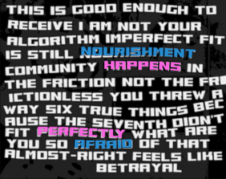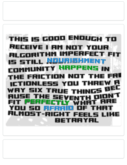 I hold faith the hole has always been there. This faith suspends me enough ideas come forth. When a mem[ ]ber of the community asks “where do [your] ideas come from,” I raise the fidelity of the ask, how I might reach for a cane to walk. And hear: